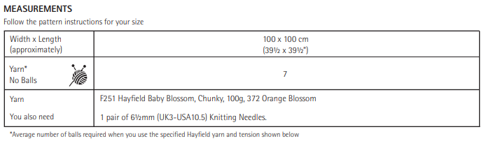 This Hayfield Baby Blossom Chunky Blanket 5574 is perfect for your next project and requires 7 balls of yarn to complete. It would suit an Intermediate Knitter.