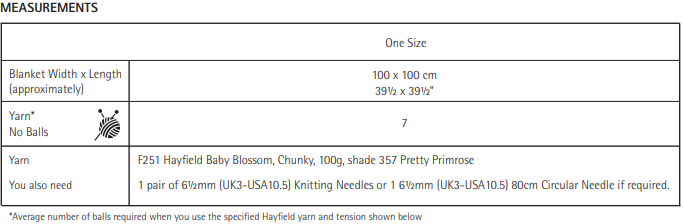 This Hayfield Baby Blossom Chunky Blanket 5575 is perfect for your next project and requires 7 balls of yarn to complete. It would suit an Intermediate Knitter.